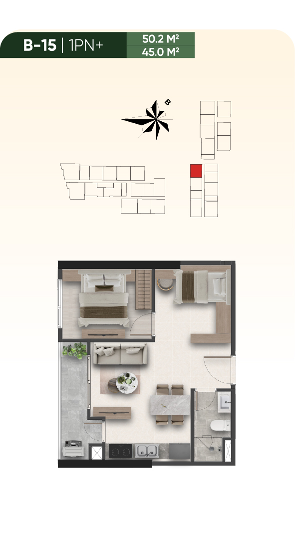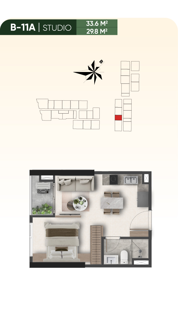- Căn hộ studio, 1 PN+ (33.6m² – 51.3m²): Thiết kế thông minh, hoàn hảo cho người độc thân hoặc vợ chồng trẻ. Đặc biệt loại 1.5PN tích hợp thêm phòng đa năng (làm việc/ngủ nhỏ), tổng giá tốt, thanh khoản cao, số lượng giới hạn.