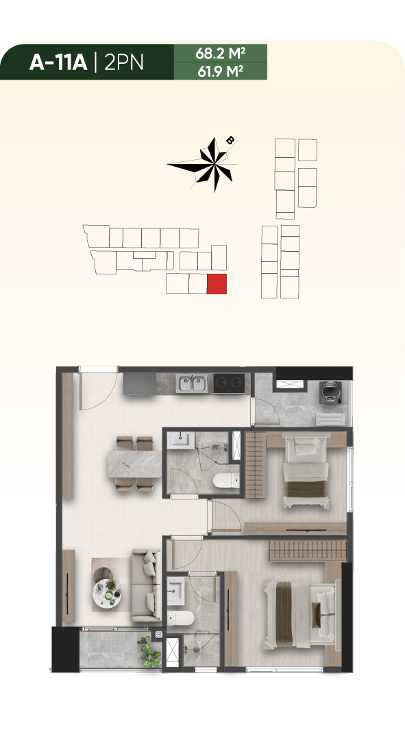 - Căn 2PN (59.8m² – 70.3m²): Layout bố trí liền mạch tạo cảm giác rộng rãi. Sở hữu ban công riêng biệt để tận hưởng không gian xanh mát. Phù hợp cho gia đình nhỏ.