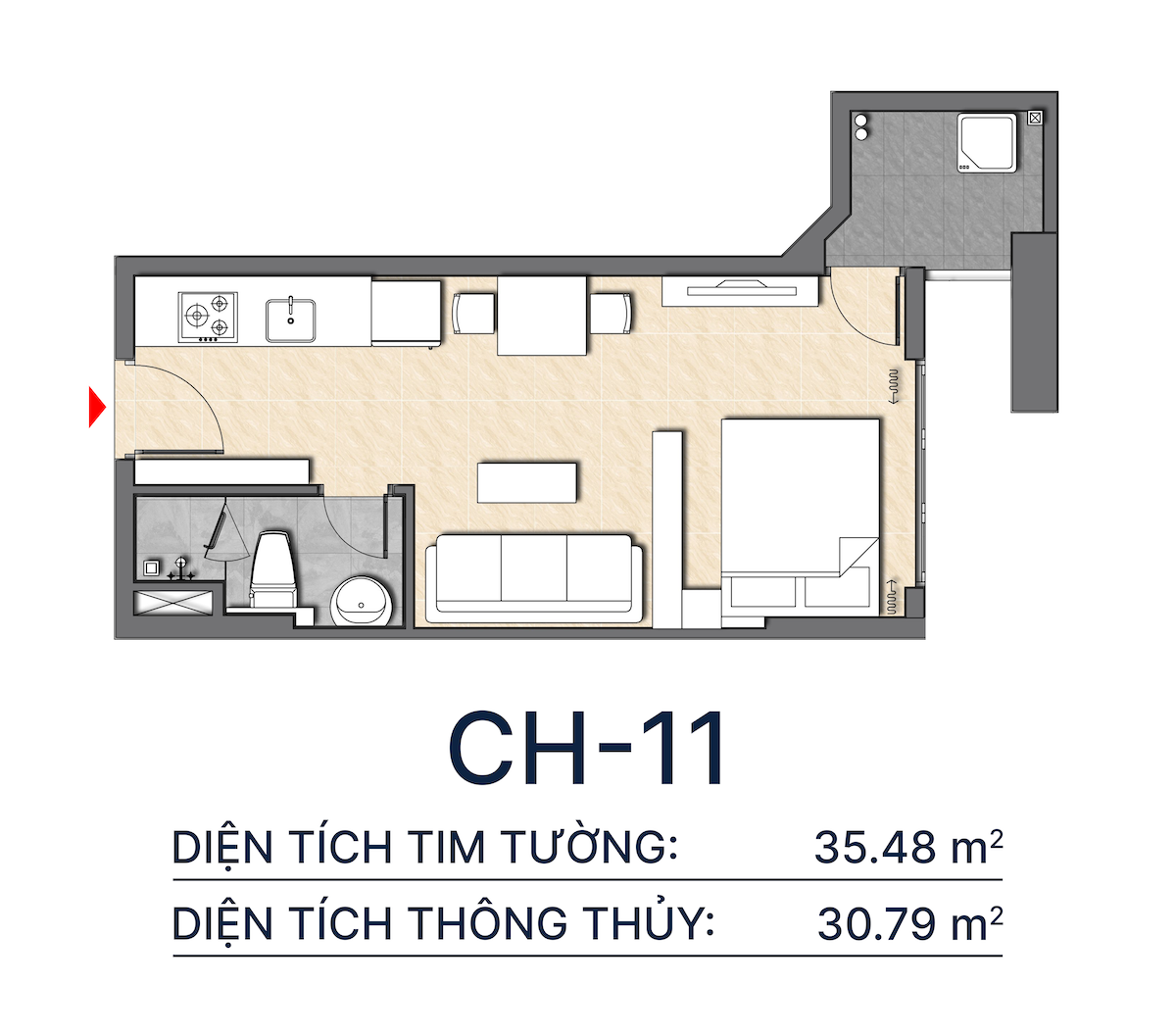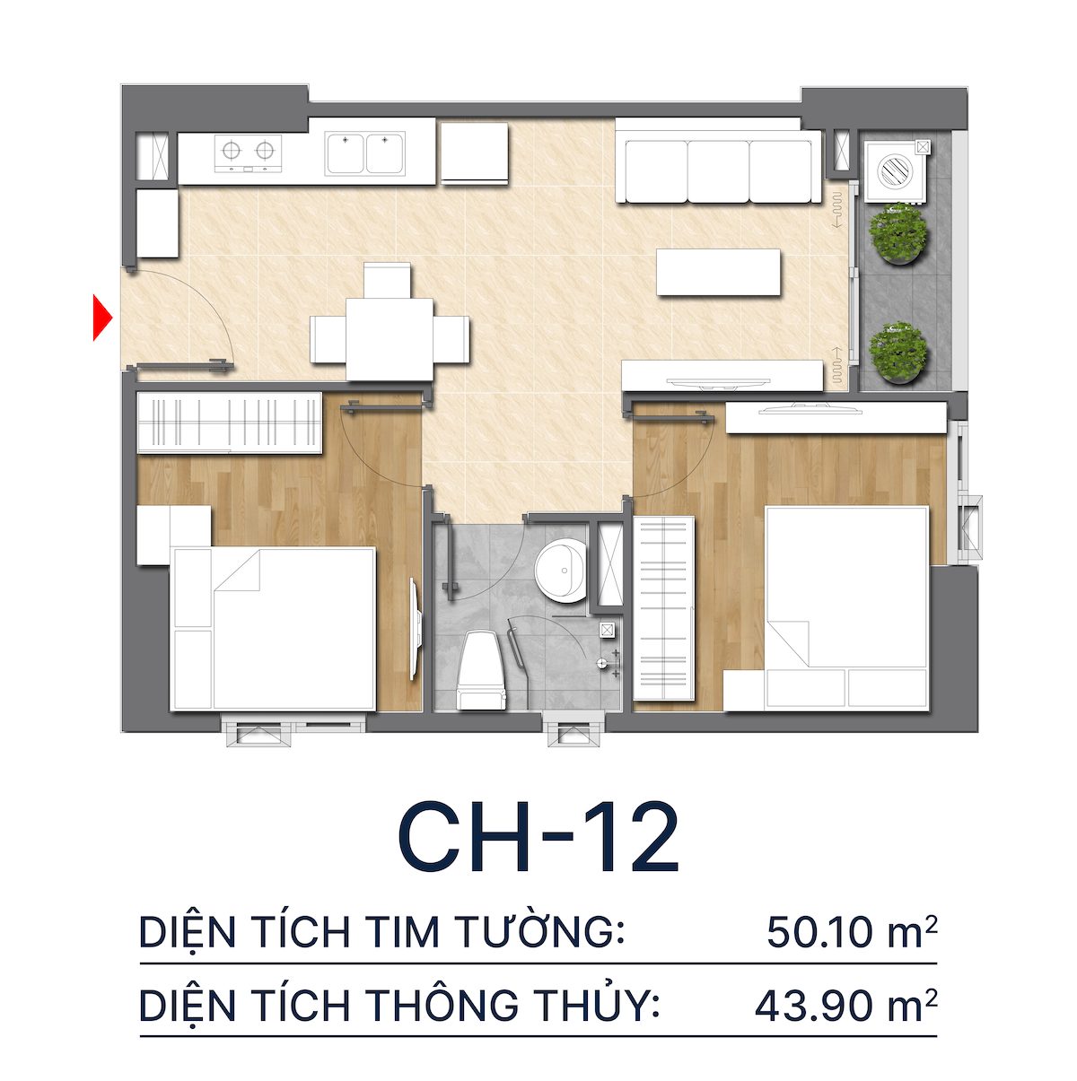- Căn hộ 2PN (50m² – 65m²): Là dòng sản phẩm chủ lực. Nhờ thiết kế tối ưu, căn hộ 50m² vẫn mang lại cảm giác vô cùng rộng rãi. Đây là cấu trúc hoàn hảo cho các gia đình trẻ và là loại hình được giới chuyên gia KCN săn thuê nhiều nhất.