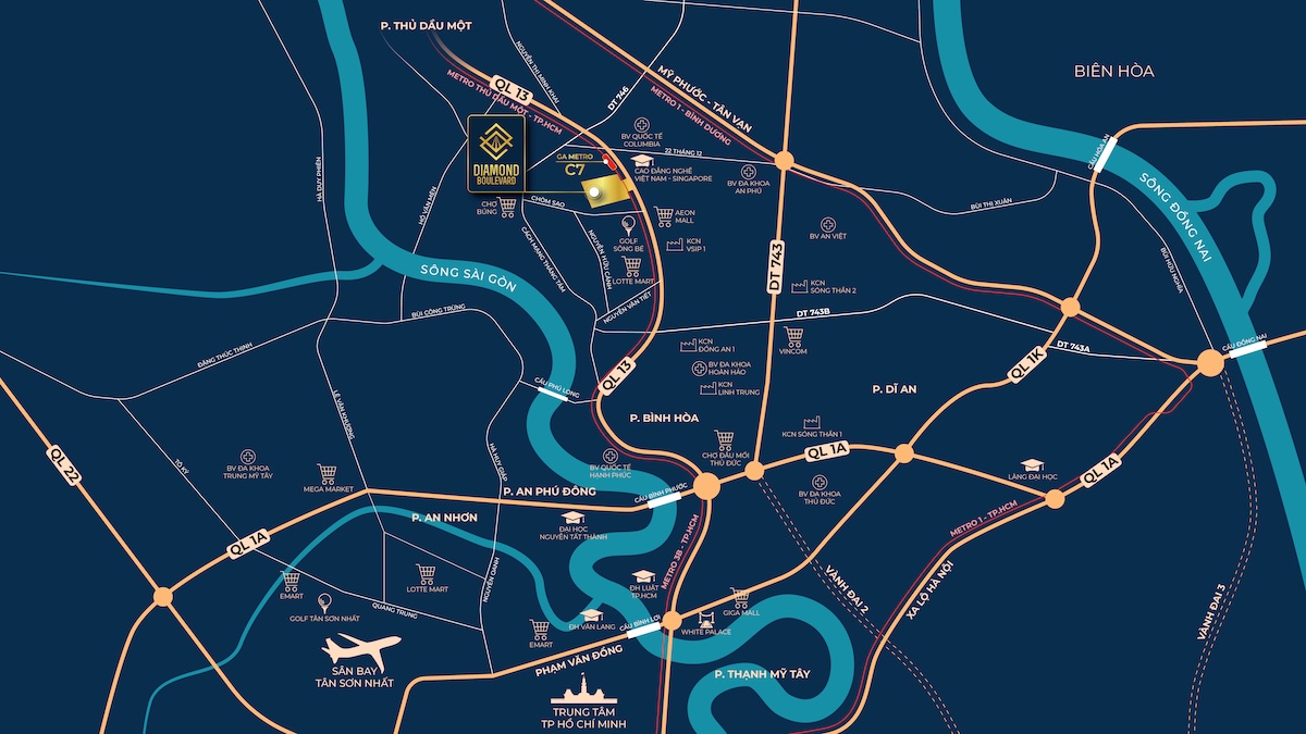 - Tuyến Metro số 2 (Thủ Dầu Một – TP.HCM): Diamond Boulevard sở hữu vị thế vô giá khi nằm sát ngay ga Metro C7. Thực tiễn thị trường luôn chứng minh, bất động sản nằm cạnh các trạm Metro (chuẩn TOD) luôn có biên độ tăng giá vượt trội từ 20-30% so với mặt bằng chung.
